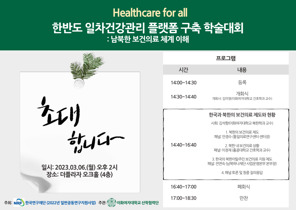 한국연구재단과 이화여자대학교가 주최한 [한반도 일차건강관리 플랫폼 구축 학술대회: 남북한 보건의료 체계 이해]의,